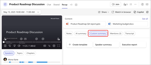 Mit einer Microsoft 365 Copilot-Lizenz stehen mit Hilfe der KI anpassbare Zusammenfassungsvorlagen zur Verfügung. Somit lassen sich Besprechungen im gewünschten Format ablegen. Weitere Informationen findest du unter Anpassen von Zusammenfassungen in Microsoft Teams.
